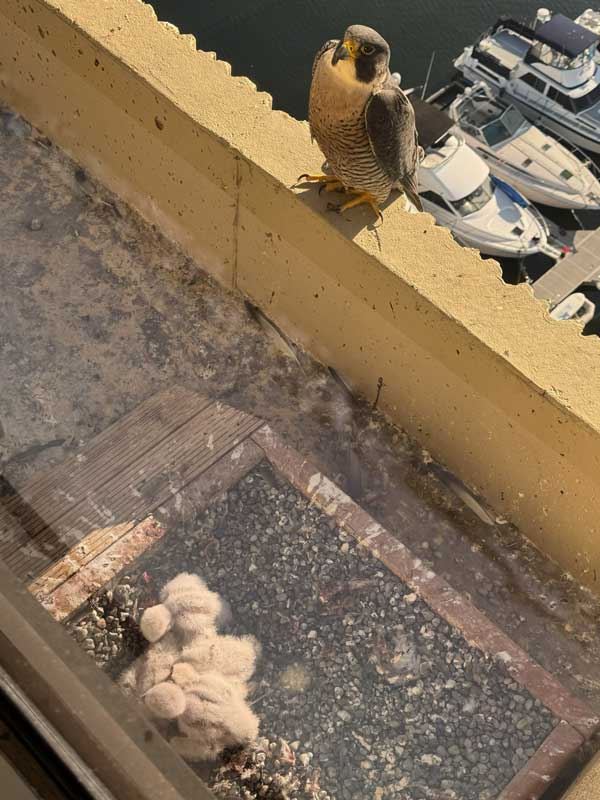 AGC of Washington. This South Lake Union building has been home to the same pair since 2021. It’s the safest site in the city: secluded upper-floor nest box, spacious balcony, and nearby safe landing places for awkward fledglings. Four eyasses hatched, but the most precocious one was lost just before fledging to overconfidence, and it drowned. Meanwhile, at a SeaTac hangar, an eyass was found on the ground below its nest. Peregrines are bad tenants in hangars… The AGC parents were now feeding only three, and they would consider any unflighted youngster at the eyrie their own; along with an unlimited supply of pigeons, this eyrie seemed like a great foster home.