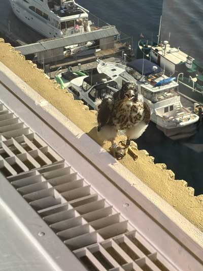 Harrowing reunion. Three survivors meant three reunions. In mid-July, the brothers were successfully reunited first, but their sister’s reunion didn’t go as easily. Instead of flying to the bridge eyrie upon her release, 42-V roosted inland on rooftops. This location seemed to baffle her parents, who flew benignly overhead but did not feed her. The standoff lasted three days, and 42-V became visibly weaker. On the fourth day, mom flew overhead with a pigeon and the brothers in pursuit. For the first time, 42-V joined the chase. She was found moments later on another rooftop by the lake shore—eating that whole pigeon. 42-V was back in the family.