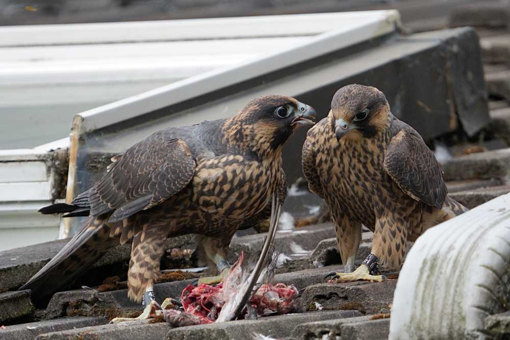King Street Station (KSS). First to hatch but last to be discovered, the KSS clock tower was a new downtown site within the same territory as the historic 1201 3rd Ave nest. Given the monthslong roof work at 1201, it’s likely that the 1201 pair moved to KSS. A serendipitous sighting at KSS in May of an adult peregrine delivering prey led to the discovery of the eyrie—and three eyasses about 3 weeks old.