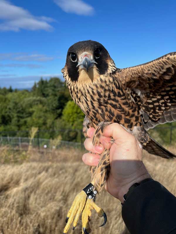 Male 21-V’s first dispersal attempt led him into a trap at SeaTac’s Raptor Strike Avoidance Program (Alex Lauber)